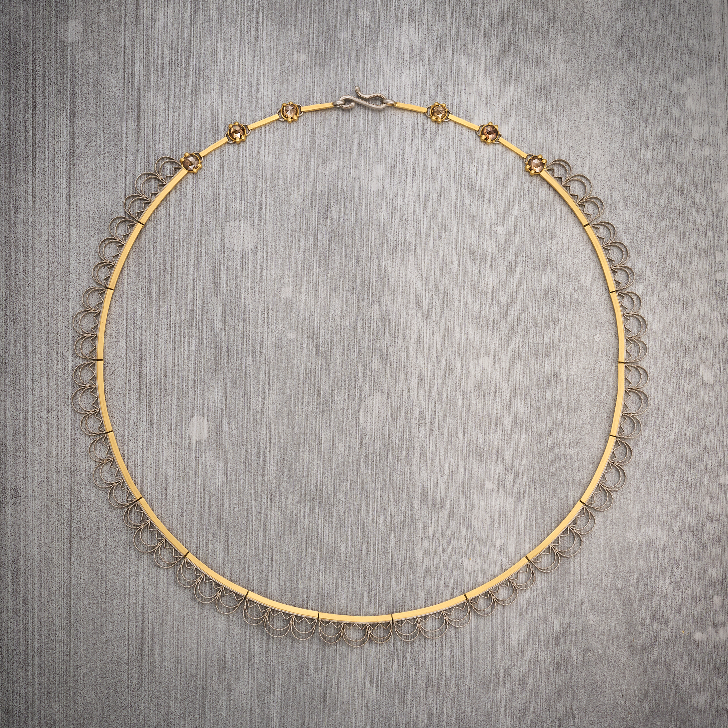 Scalloped necklace in platinum and 18k gold with rose cut round diamonds.
