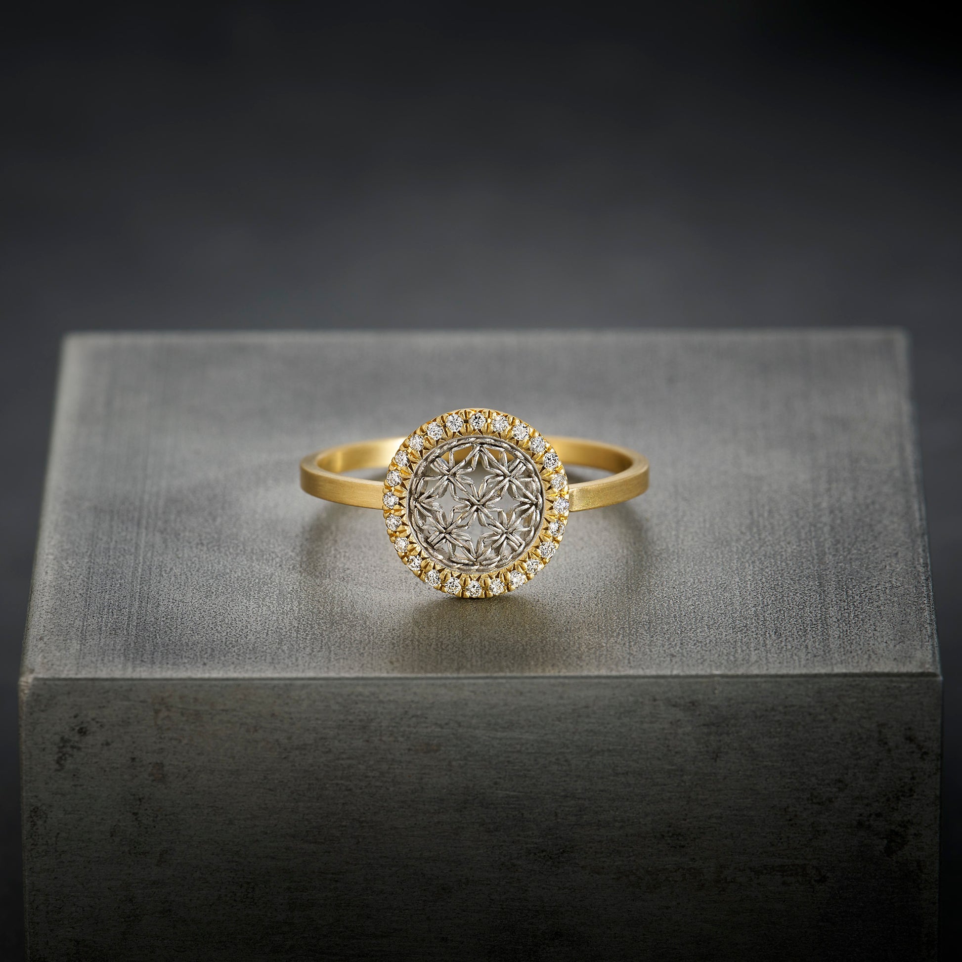 Small round damask ring with white diamonds in 18k gold and platinum.